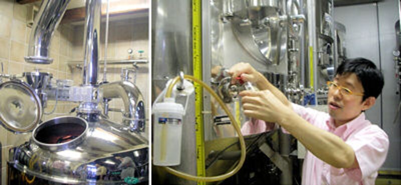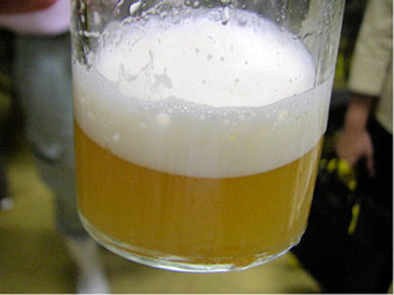 | 非常に清潔なビール工場内。前日仕込んだばかりの赤ちゃんビールを試飲させていただく。 |