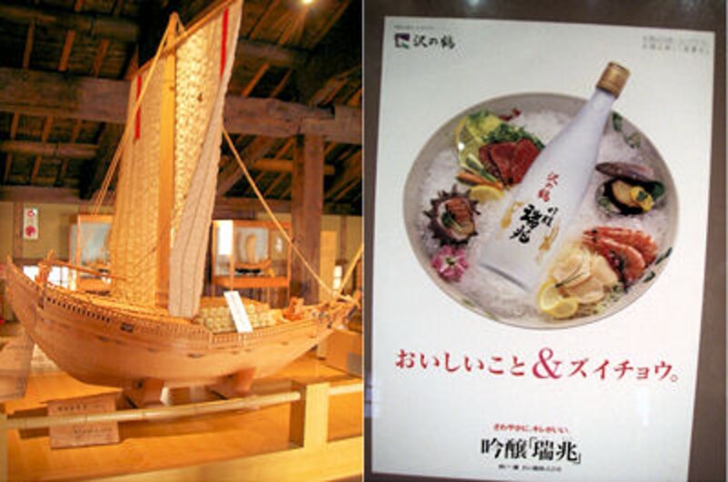 | (左)灘から江戸へ酒が運ばれた「樽廻船」のミニチュア。精巧に出来ていて見飽きない。 (右)アルコール13パーセントほどの低アルコール酒である「吟醸 瑞兆」。初めて飲んだのは20年以上前だった。低アルコール酒としては草分けだろう。さっぱりとした口当たりと優しい味わいがポスターのイメージどおりのお刺身よく合う。 |