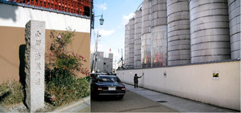 | まるで石油コンビナートのようなタンクが並ぶが、散策できる道はきれいな土塀に囲まれ、マンションなども酒蔵のような外観に統一されていたり、あちこちに気遣いが見られ楽しい。 |
