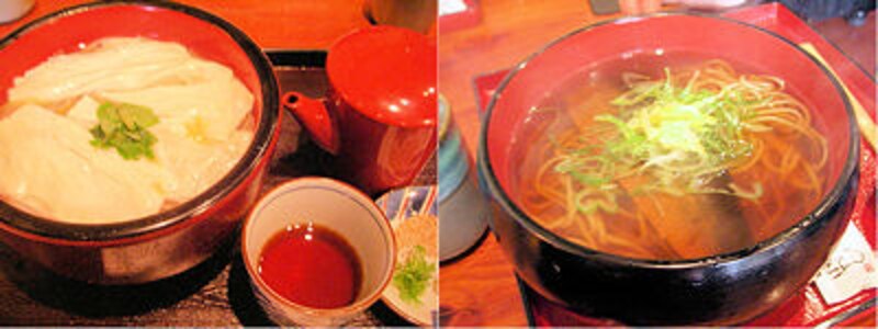 | (左)「さかばやし」の「湯葉そば」1,050円。写真は大盛1,410円。(右)にしんそば940円。季節の豆腐料理膳2,620円、そば膳1,890円、会席コースが3,670円~など。お酒は飲み比べが出来る、純米酒70ml×4種の「純米和音」1,500円や季節のひやおろしグラス680円などなど、さまざまなタイプを楽しめる。 |