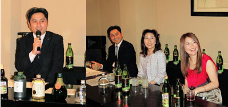| 発足式に駆けつけてくださった本格そば焼酎のメーカー「雲海酒造」の福田工場長(左)。そば焼酎の魅力をわかりやすく語ってくれた。ワタクシ友田も解説者として参加。 |
