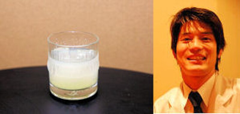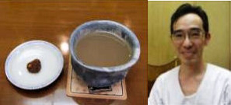 | 濃い目のそば湯を使用した藪伊豆のそば湯割りと店主野川喜央さん。 |
