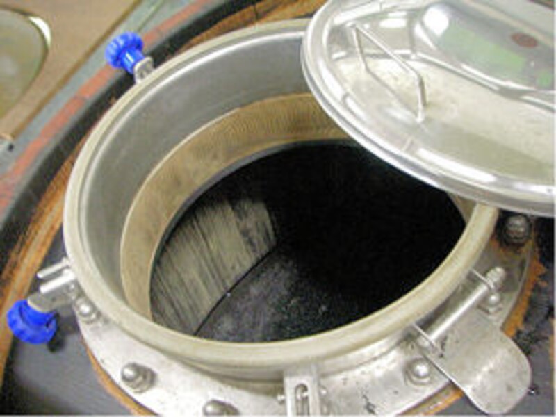 | 昔ながらの木桶蒸留機。中身はそのまま生の木材になっている。高温にも耐えられる。 |