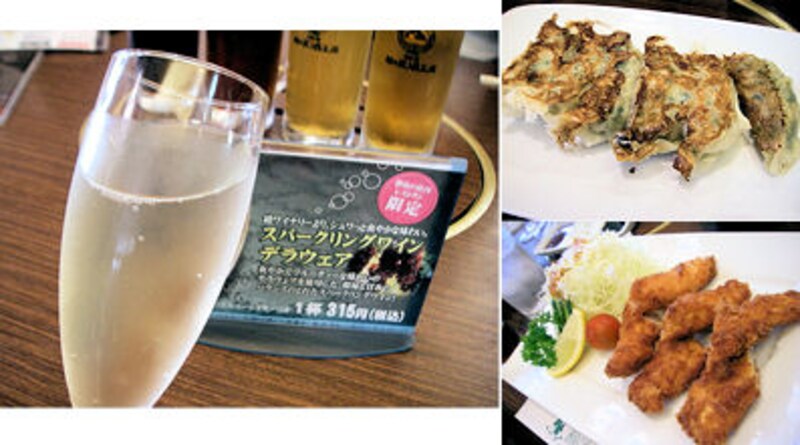 | 甘酸っぱい味わいのデラウエアのスパークリング。餃子や鶏ささみの唐揚げなどともバッチリの組み合わせ。 |