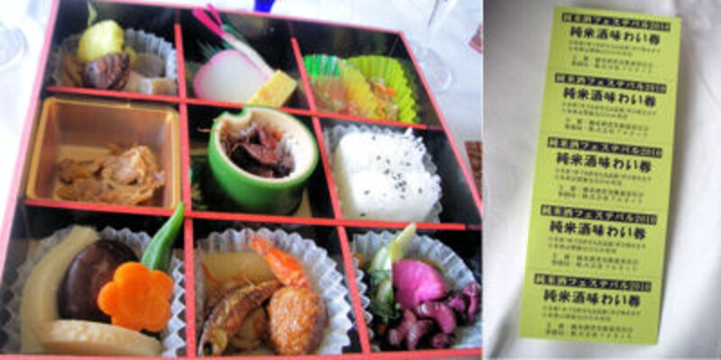 おつまみになるお弁当付き。お猪口で飲み放題だが、「味わい券」を渡せば、大振りのワイングラスでたっぷり楽しめる。コレで、本日の人気種ベスト10がわかるかな?