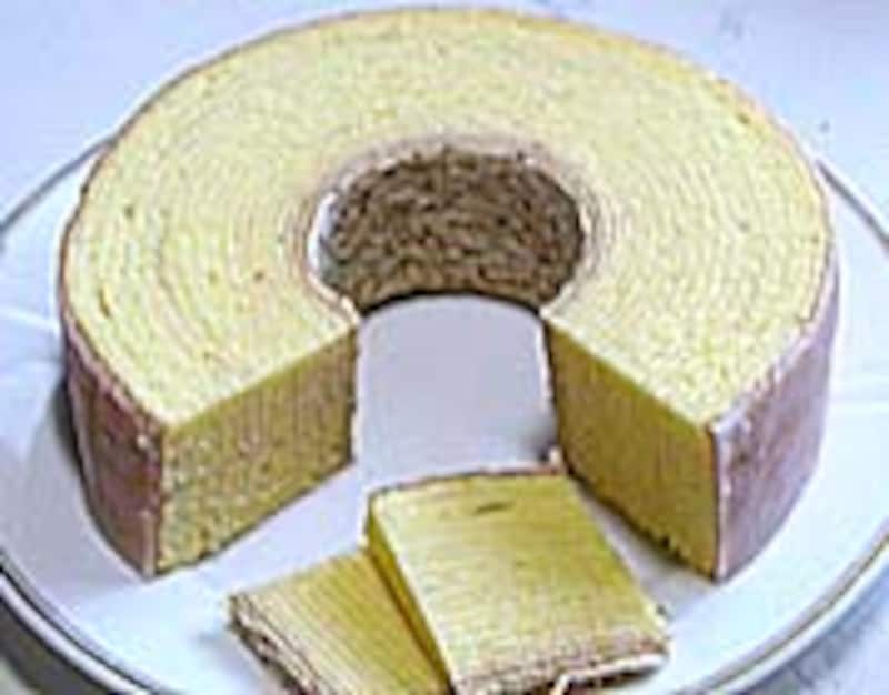 滋賀県近江八幡市の和菓子屋さん「たねや」のプロデュース。第2次バウムブーム(?)の火付け役ともなったバウムクーヘンです。こちらは周りに砂糖(フォンダン)が塗ってあります。フォンダンと一緒に食べるのと、フォンダンなしで食べるのと、2通りの味わい方を楽しんでみてください(ただし、甘いものが苦手な方はフォンダン部分は甘すぎるかも…)。触感はソフトで、ふんわり。口の中でとろけるような感触は、今までのバウムクーヘンにはなかったかも。引菓子の場合は、ピンクの包装紙に金銀の水引を掛けてくれます。「バームクーヘン」(直径14センチ 高さ5.0センチ)800円。ネット通販OK。