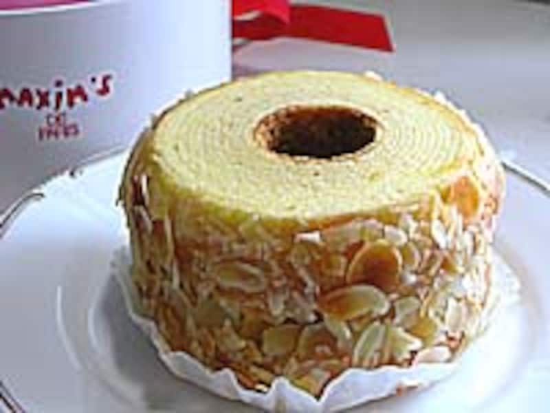 なんとあのマキシムからもバウムクーヘンが出ていたのですね! ブライダル用商品なので、ショップでは展示していないようです。他のバウムに比べるとわりと小ぶりで、一人暮らしの友人への引菓子としてもおすすめ。周りに薄切りのアーモンドが貼ってあって、香ばしい。マキシムのバウムクーヘンだけあって、フランス菓子っぽい感じかな? しっとりとした触感で、濃厚な味わいです。ブライダルハットボックスという名前だけあって、帽子箱を思わせるキュートなラッピングも素敵です。「ブライダルハットボックス」1000円。ネット通販OK。