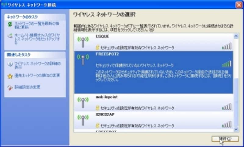 2. いくつかアクセスポイントが表示されますので、FREESPOTという名称のアクセスポイントを探してください。今回は、FREESPOTとFREESPOT2が表示されました。そこで、まずはFREESPOT2に接続してみます。方法は、FREESPOT2をクリックして選択し[接続]ボタンを押すだけです。