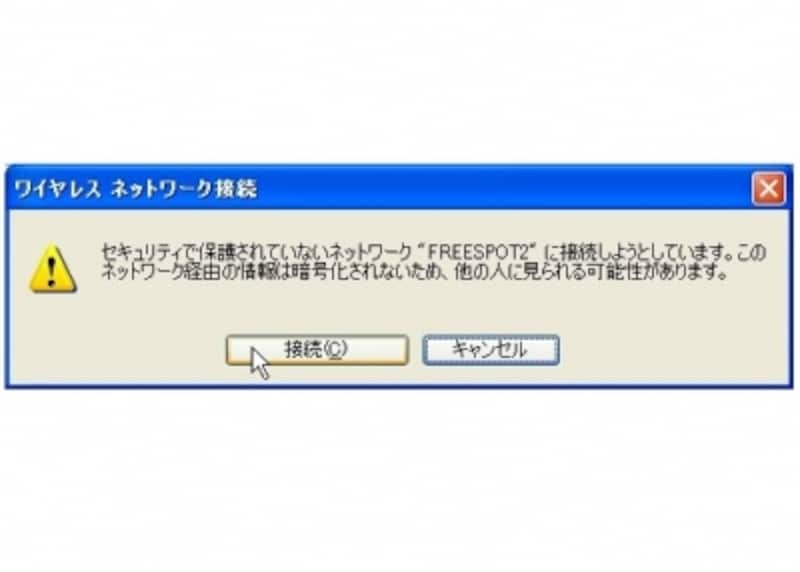 3. 「~他の人に見られる可能性があります。」というダイアログ表示されますが、氏名住所といった個人情報をWeb側に送信しなければ、特に問題ありません。また、システム側でフォルダの共有に利用するポートが閉じられていますので、自分のコンピュータに他人が侵入する恐れもありません。安心して[接続]ボタンを押してください。これで接続が完了です。