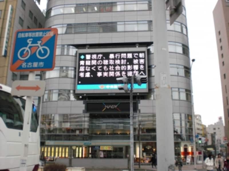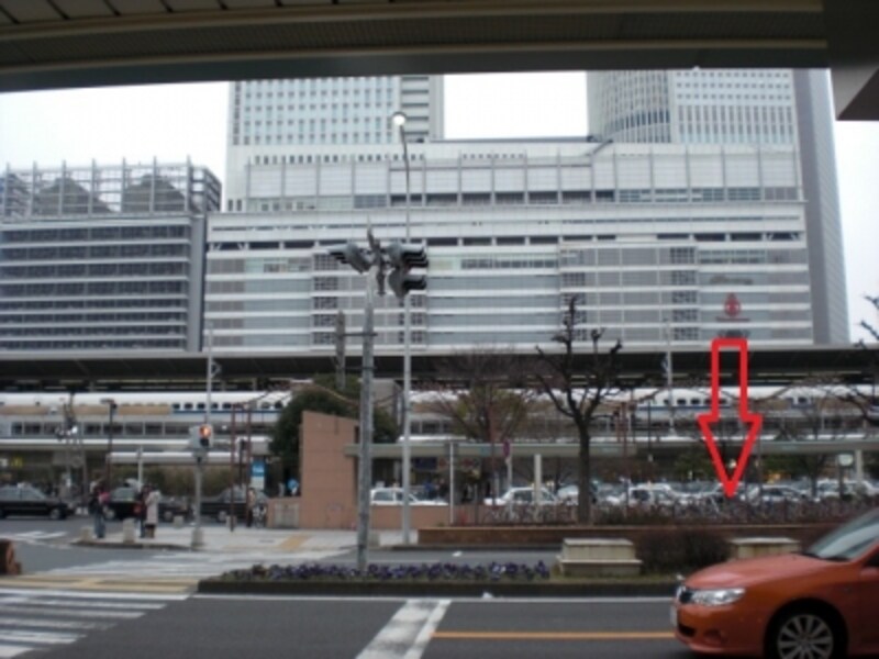 ここで、アクセスポイントから少し離れた地点で調査してみることにしました。調査ポイントは、下図の赤い矢印のポイントです。ここは、大型ビジョン前から片側4車線道路を隔てて向こう側にあたる場所で、下の写真は、大型ビジョン前から撮影ポイントを見た写真です。
