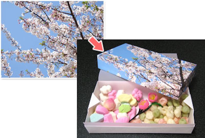 | 桜の写真で、ひなあられの菓子箱を作った例です。 |