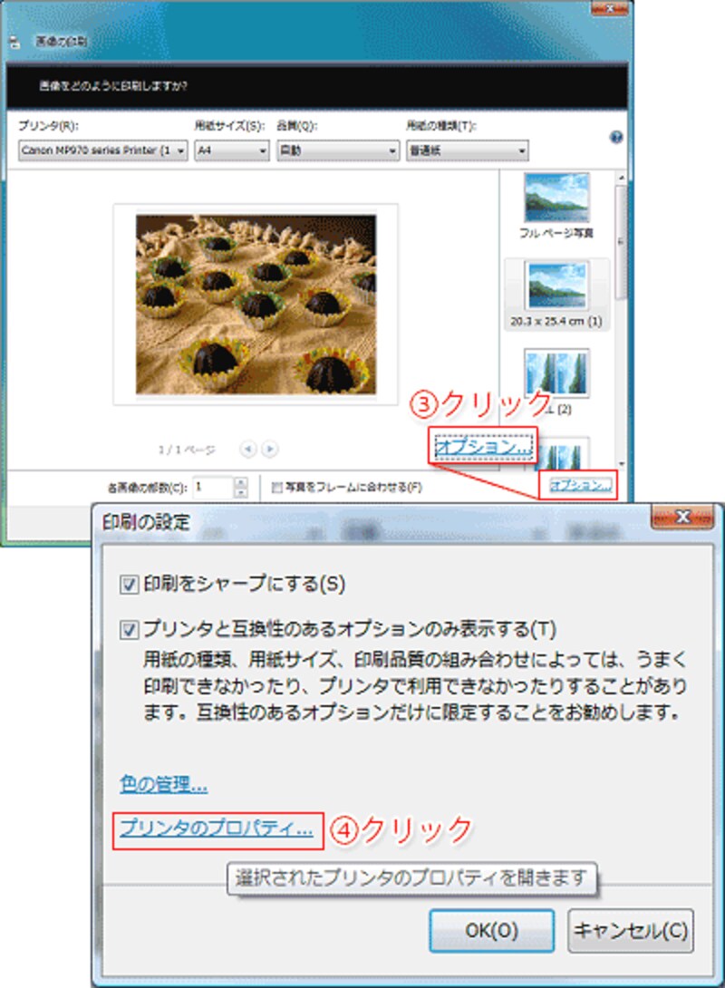 - [画像の印刷]ダイアログボックスが開きますので、プリンタの設定をします。[オプション]をクリックします。