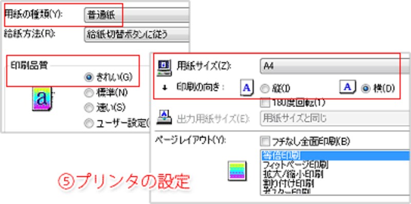 - プリンタの設定ダイアログボックスが開きます。プリンタの機種によって画面が異なりますが、ここでは印刷する用紙に適した[用紙の種類]と[印刷品質]を設定します。また[用紙サイズ]を[A4]に、[印刷の向き]を写真の向きに合わせて設定します。[フチなし]の設定は解除しておきます。