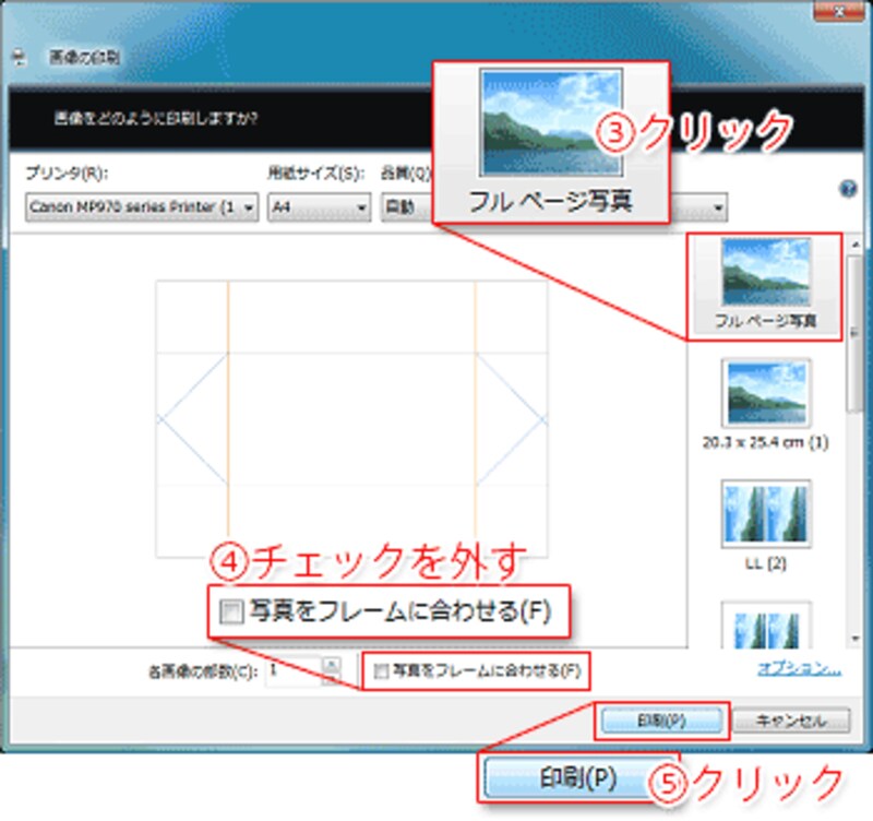 - [画像の印刷]ダイアログボックスで[フルページ写真]をクリックします。