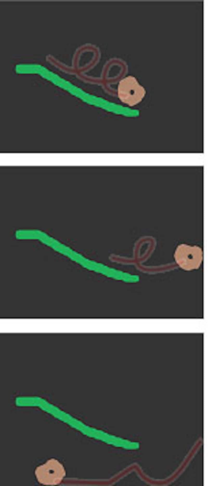 | 緑色の線で坂を描き、その上に「弾性体」の茶色いドーナツ型のタイヤを描いています。 |