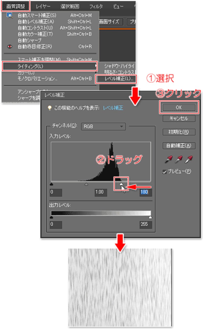 - [レベル補正]ダイアログボックスが開きますので、山型のヒストグラム右下にある[△]を左にドラッグして、山型の右裾に合わせます。