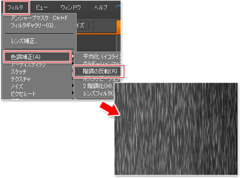 雨の部分を白に、それ以外の部分を黒に変換します。[フィルタ]メニュー→[色調補正]→[階調の反転]を選びます。