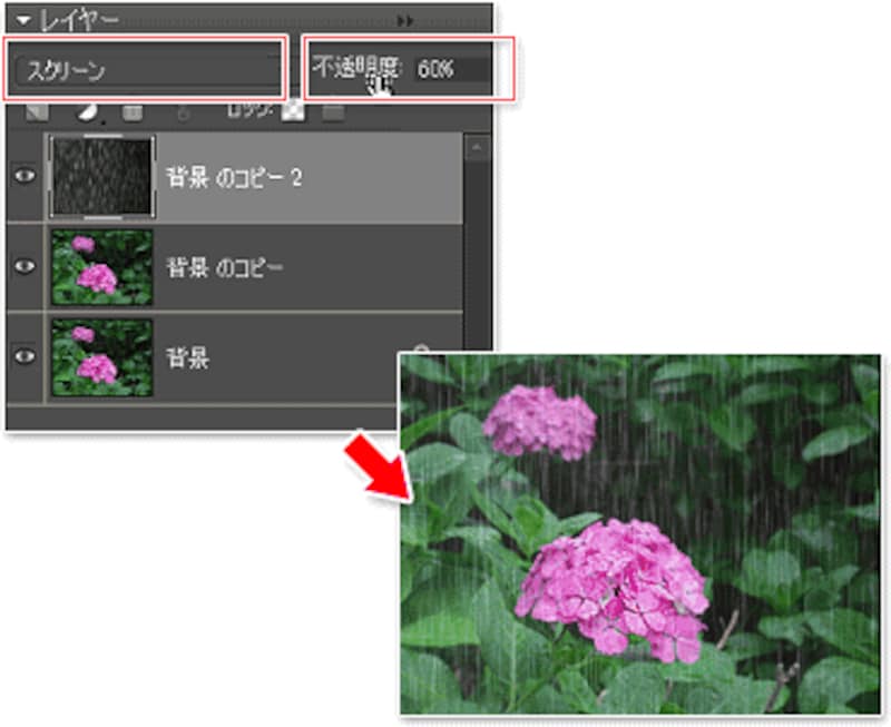 [レイヤー]パレットの[レイヤーの描画モードを設定]を[スクリーン]に変更して、[不透明度]を調整します。土砂降りにするのなら不透明度を大きめに、小雨にするのなら小さめに設定するといいでしょう。
