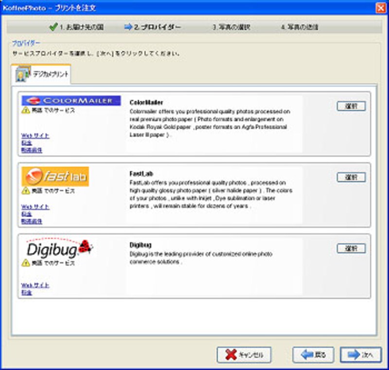 | KoffeePhotoソフトウェアでは、届けたい国のプリントサービスを探し出してくれます。 |