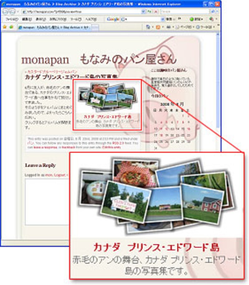 | KoffeePhotoソフトウェアの[このアルバムをWebサイトで公開]を選び、HTMLコードをブログに貼り付けると、アルバムへのリンクが画像付きで表示されます。 |