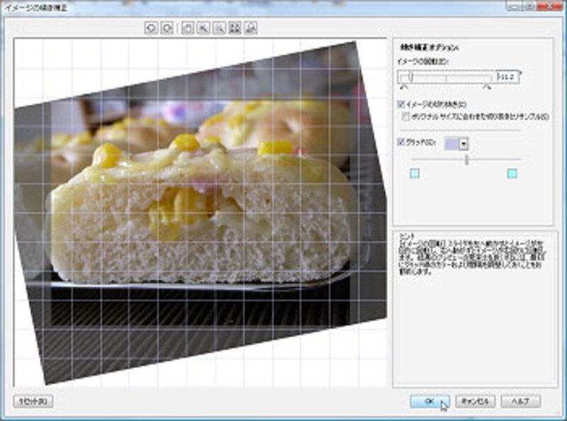 傾いている写真を「イメージの傾き補正」で素早く簡単に角度を補正して切り抜くことができます。