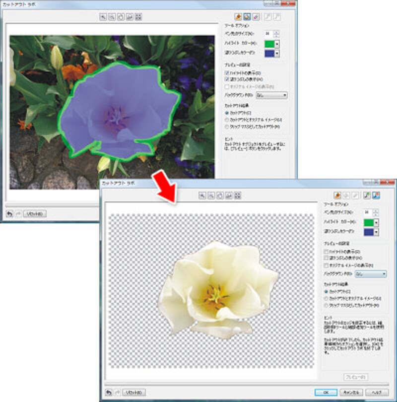 写真の輪郭をなぞることで、形をきれいに切り取る「カットアウトラボ」の機能も強化されています。