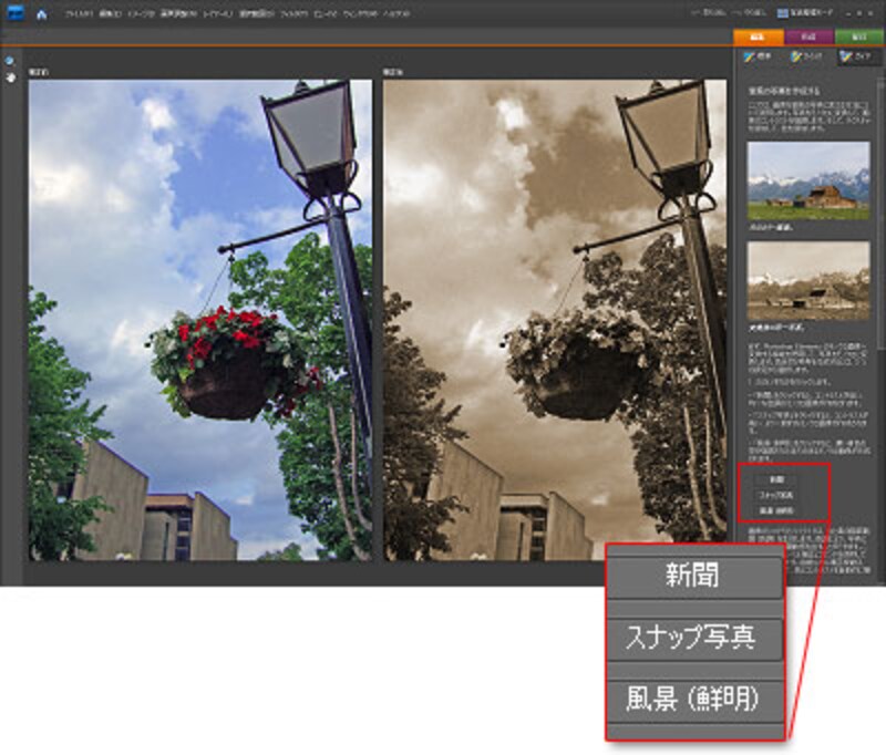 また、年期を経た質感のあるモノクロ写真風に加工するテクニックにも、これまでは数手順が必要でしたが、新ガイド機能の「昔風の写真を作成する」では、わずか3クリックするだけで仕上がります。