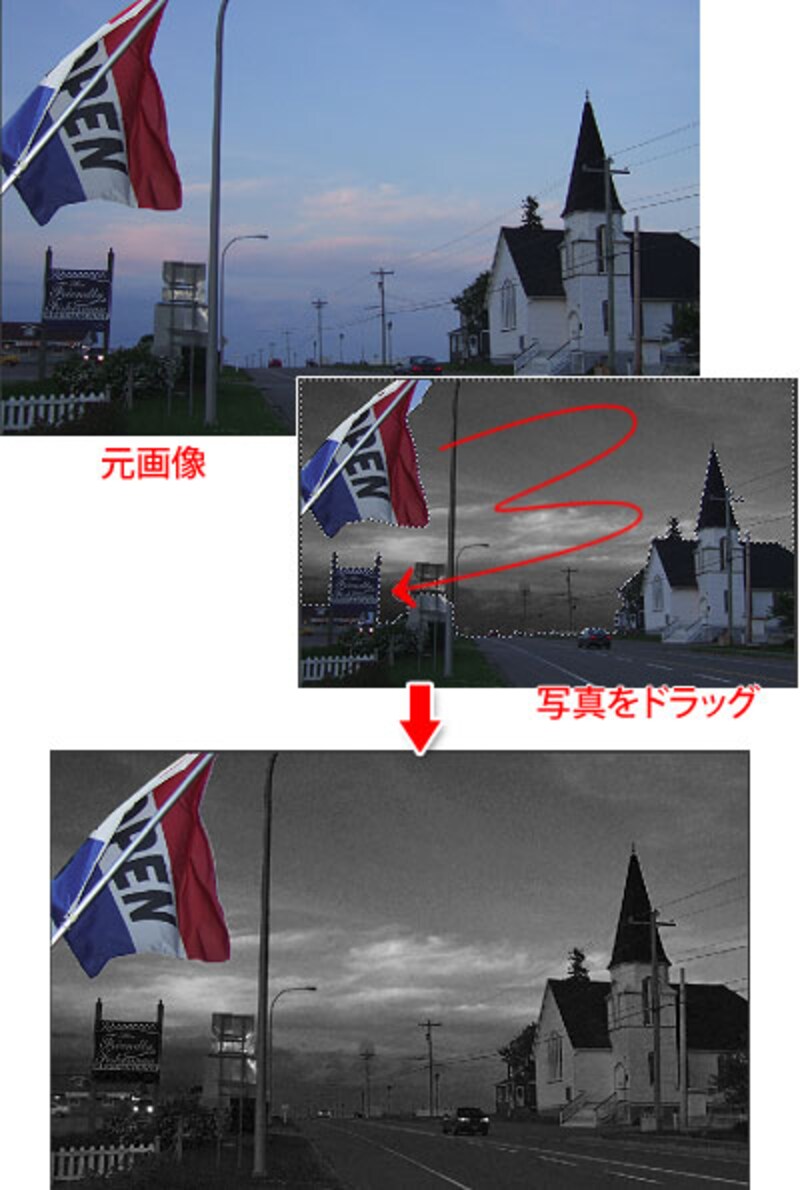 | 旗以外の部分をドラッグするだけで、背景がみるみる白黒に変化していき、終いには旗だけが色づいている写真になります。 |