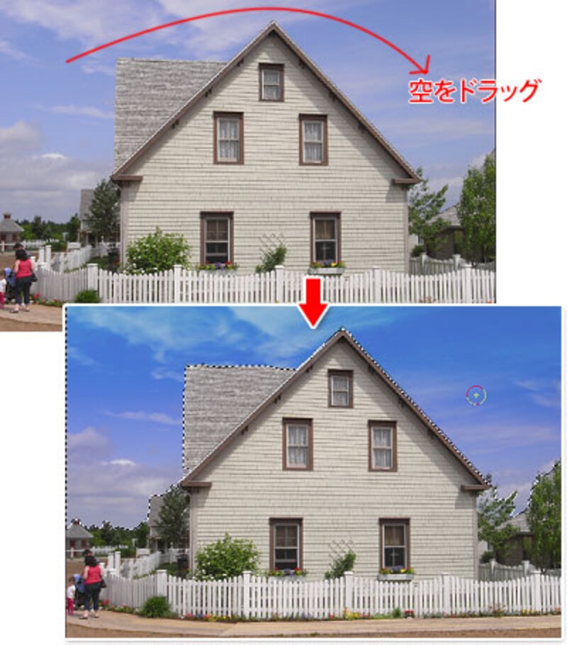 | 一見青空に見える写真ですが、空をドラッグすると、さらに鮮やかな青空へと変化します。 |