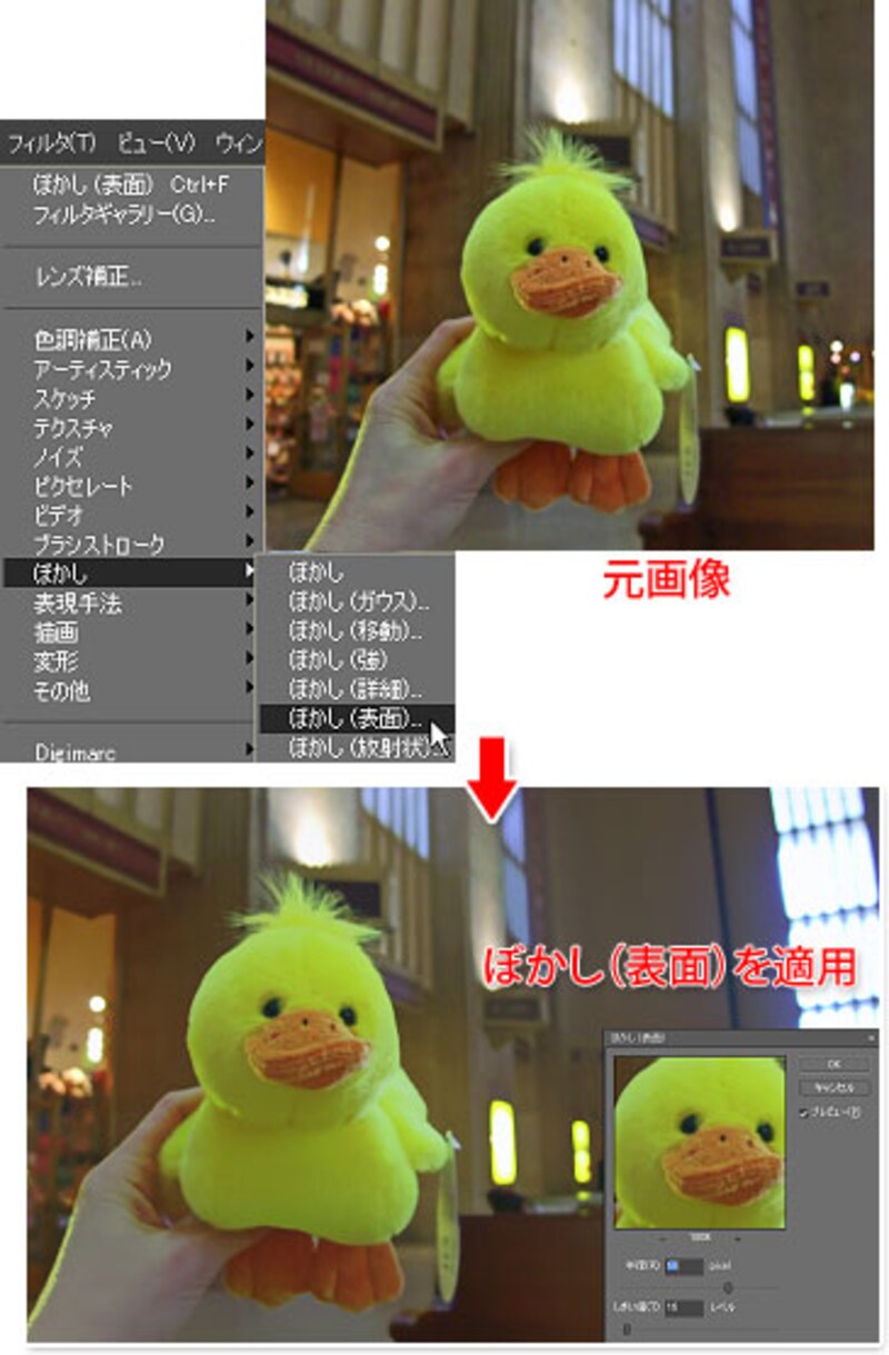 | 「ぼかし(表面)」フィルタによって、手のしわや、アヒルの表面の凹凸がなめらかに処理されています。 |