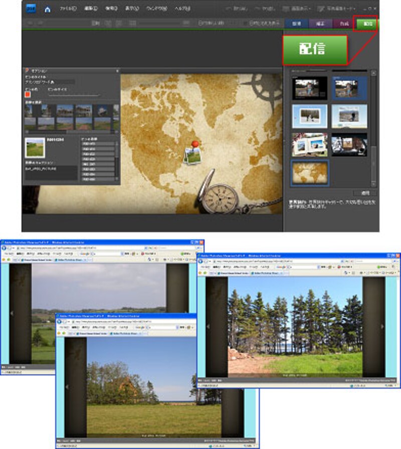 | 「配信」でアルバム用の写真を選び、テンプレートから新しいテーマ「世界旅行」を選択。オプションで見せ方を選び、Adobe Photoshop Showcaseへアップロード、Webでアルバムをすぐに公開できます。 |