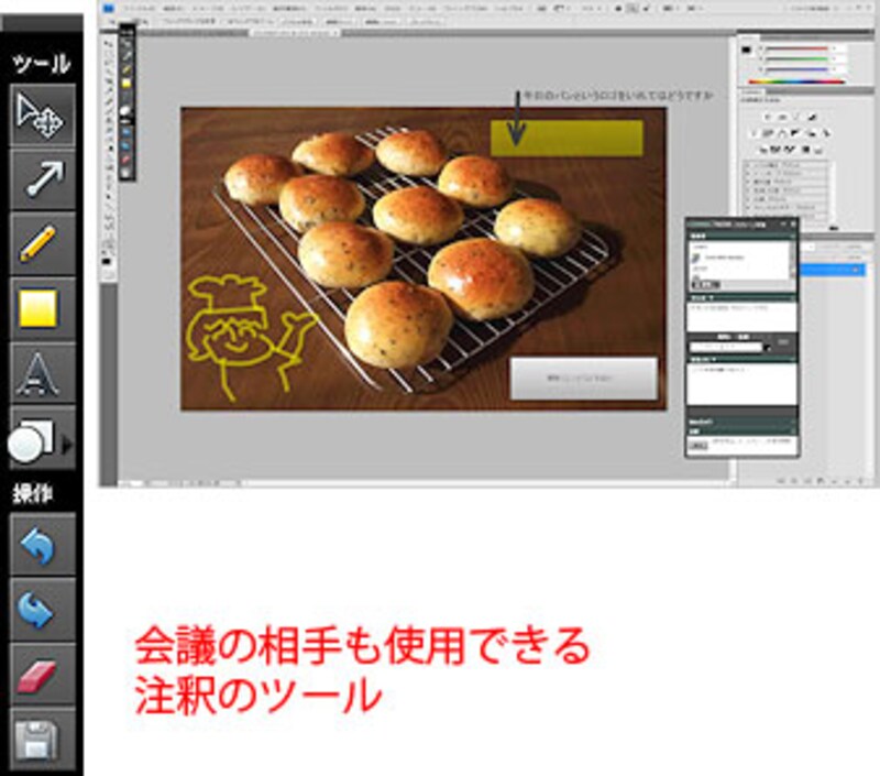 相手側がPhotoshopを持っていなくても、「Adobe ConnectNow」で接続して会議に認証されれば、Photoshopが映し出された画面に注釈ツールで直接指示を書き込めます。
