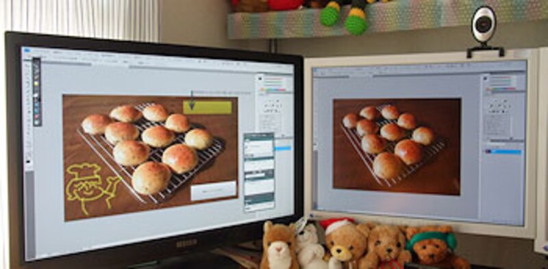 | マルチ画面であれば、1画面がPhotoshop、もう1画面を会議用の画面として使用して、効率アップ。 |