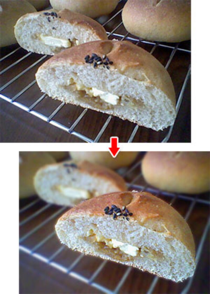 | 上がDSiカメラで撮った写真。手前のパンの輪郭を選択し、この部分にシャープネス効果をかけてはっきり見せます。背景は「ぼかし(ガウス)」で全体的にぼかし効果を加えると、手前のパンの印象度が上がります。 |
