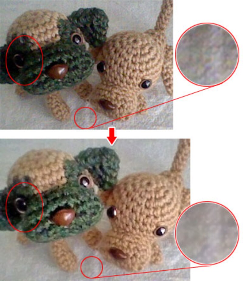 | 「シャドウ・ハイライト」で暗い部分を明るく見せることで、犬の目の周りの影部分の詳細が見えるようになります。また背景の白い部分にある色の斑点を目立たなくしています。 |