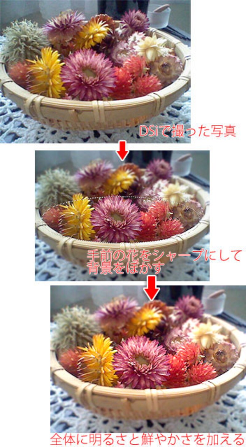 DSiカメラには接写モードがありませんから、花や物などの被写体の周りをぼかすといった撮影ができませんし、また、本体にもそのような加工ツールがありません。
