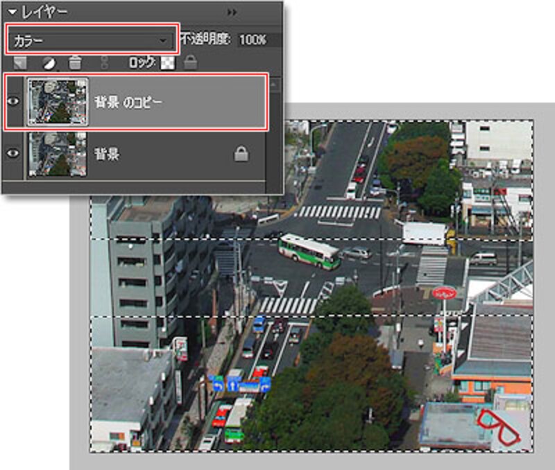 確定しましたら、「背景のコピー」のレイヤーの描画モードを「カラー」に変更します。
