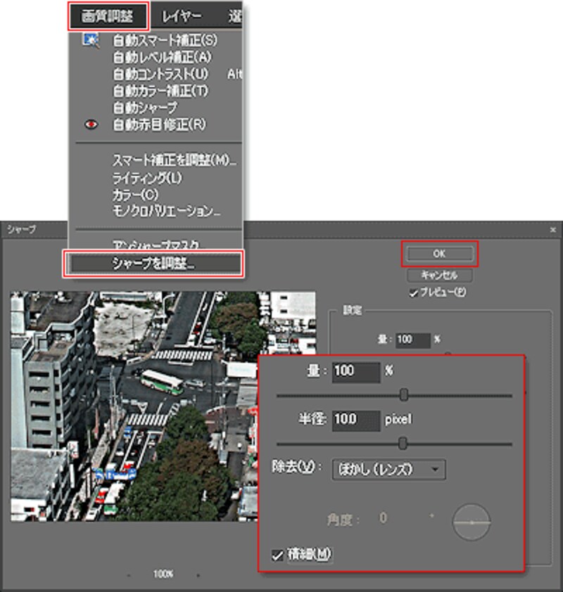 「シャープ」ダイアログが開きます。「除去」は「ぼかし(レンズ)」を選び、「詳細」にチェックを入れます。「量」と「半径」はやはり写真の大きさによって数値が変わりますが、プレビューを見ながら、写真の輪郭に黒や白の太い線が加わっているのがわかる程度に調整します。ここでは「量」を「100%」、「半径」を「10pixel」に設定して、「OK」をクリックします。