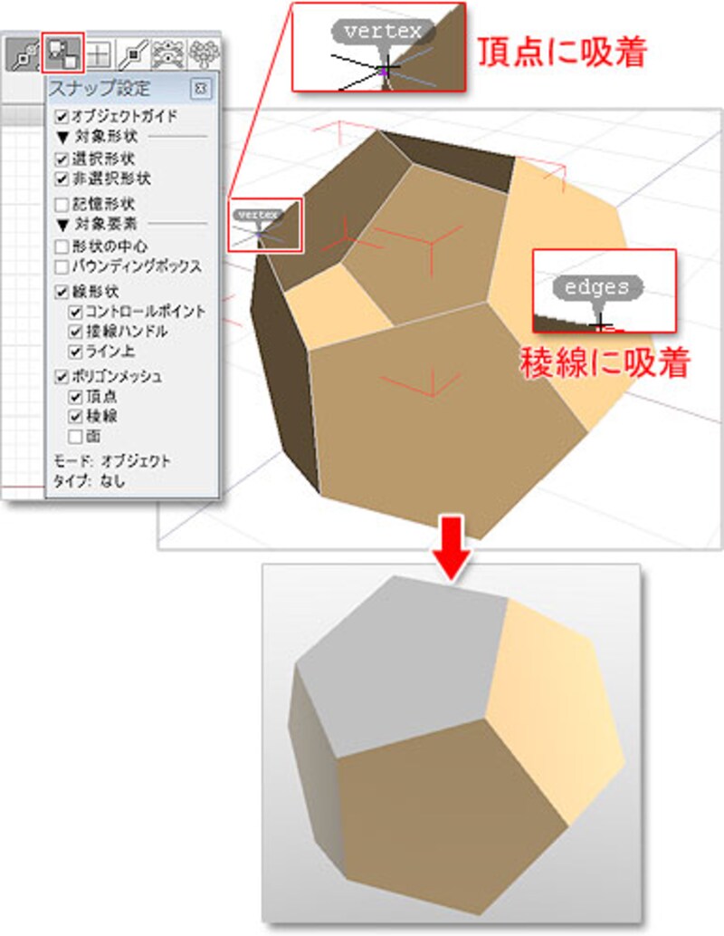 「オブジェクトガイド」を有効にして、「スナップ設定」でどこにスナップさせるのかを指定すると、稜線や頂点などにカーソルが重なったときに「edges」「vertex」という吹き出しが表示されるので、そのタイミングでクリックして正確にスナップさせます。