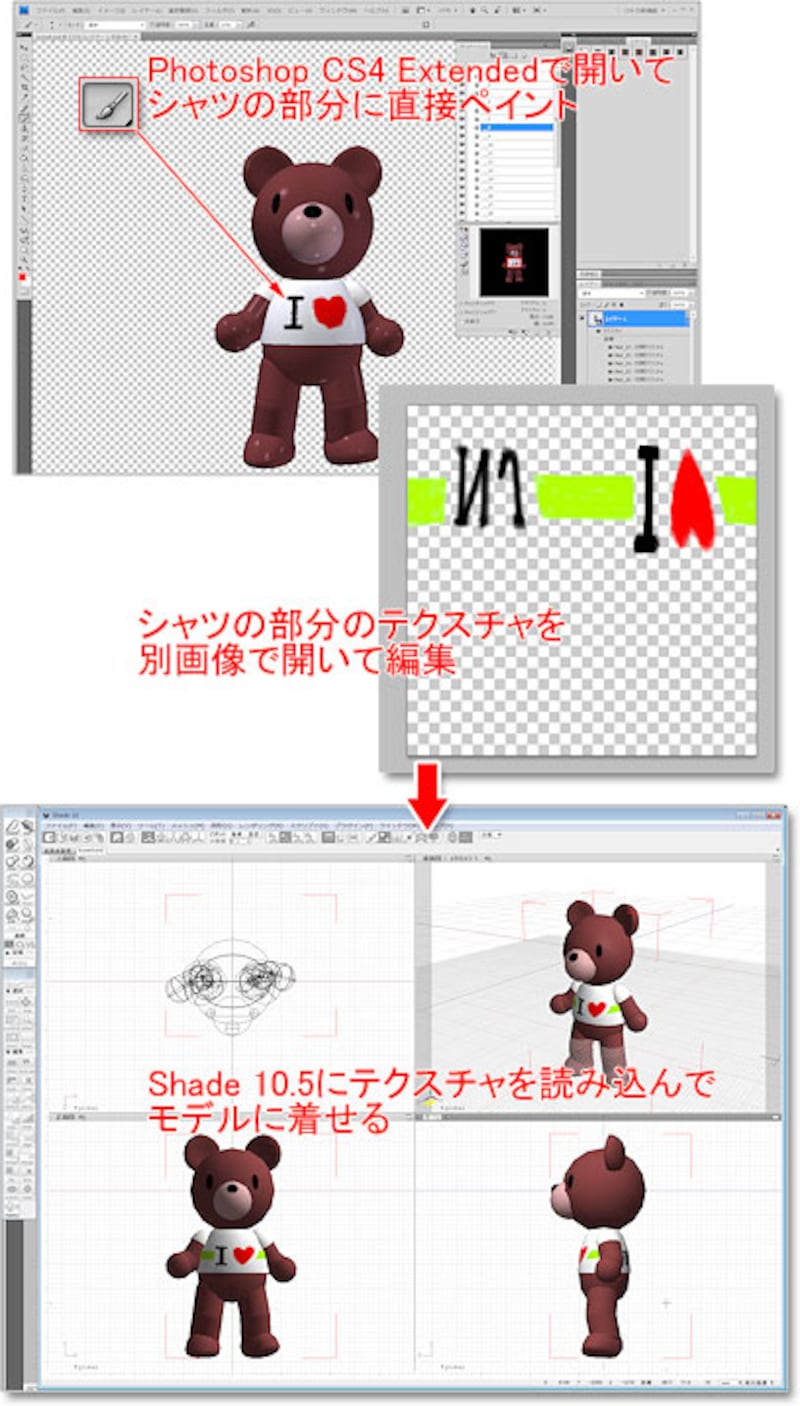 また、Shadeで作成した3Dデータを、3Dツールが強化されたAdobe Photoshop CS4 Extendedで開いて、直接3Dモデルにテクスチャやマッピング用の画像を描き重ねることができます。