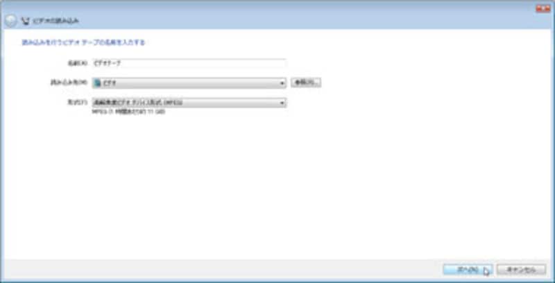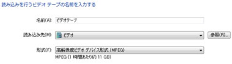 「ビデオの読み込み」ダイアログボックスが表示されるので、テープの名前や読み込んだデータの保存先フォルダの指定、読み込むファイルの形式などを設定します。なお、読み込み先は、デフォルト(初期設定)では「ビデオ」フォルダに設定されています。
