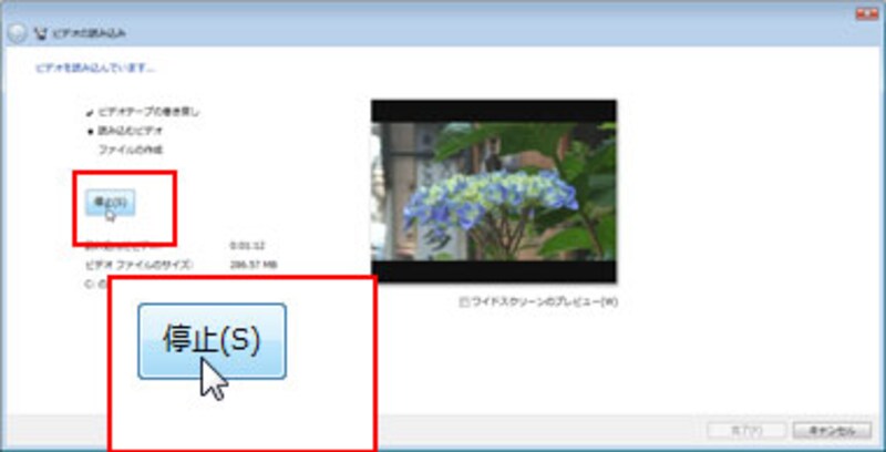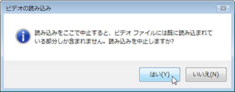 読み込みを途中で停止する場合は、「停止」ボタンをクリックします。このとき、映像は途中までしか読み込まれないがよいかという確認メッセージが表示されるので、「はい」ボタンをクリックします。