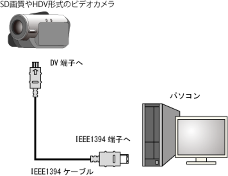ビデオカメラをパソコンに接続します。ムービーメーカーの場合、SD(標準画質)タイプやHDVなど、記録メディアにminiDVテープを利用したビデオカメラが取り込み対象の主流になります。この場合、ビデオカメラとは主にIEEE1394端子どおしを接続します。