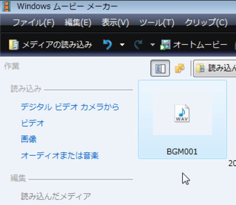 「オーディオまたは音楽」を選択すると、動画ファイル同様に、オーディオファイルも読み込めます。BGM用のデータを読み込んでおきましょう。