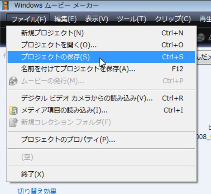 現在編集中の内容を、「プロジェクト」として保存しておきましょう。保存しておけば、ムービーメーカーを再起動した際、編集を中断したところから再開できます。