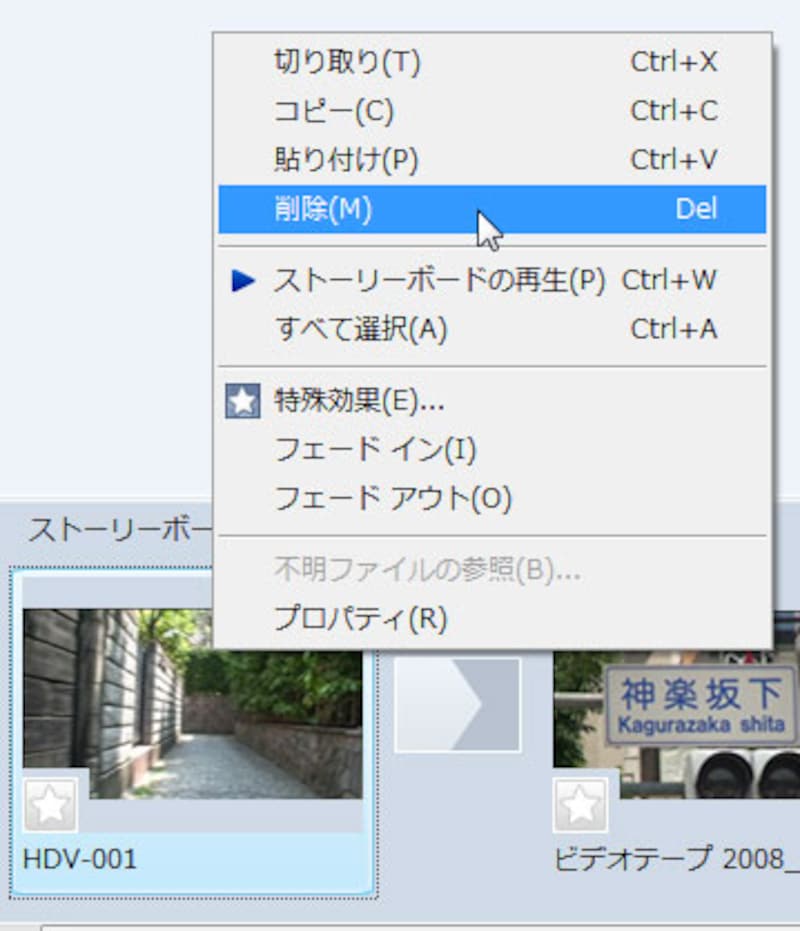 ストーリーボードに配置したビデオクリップが不要になった場合は、不要なクリップを選択して、「Delete」キーを押すか、右クリックして表示されたメニューから「削除」を選択してください。ストーリーボードからビデオクリップを削除できます。