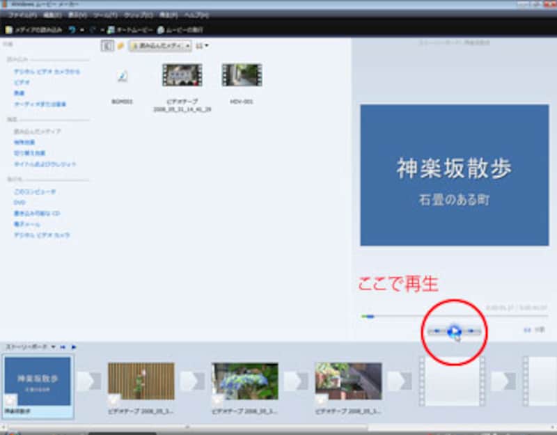 プレビューウィンドウの「再生」ボタンをクリックし、タイトルを確認します。ムービーメーカーでは、タイトルに自動的にアニメーションが設定されています。それを確認してみましょう。