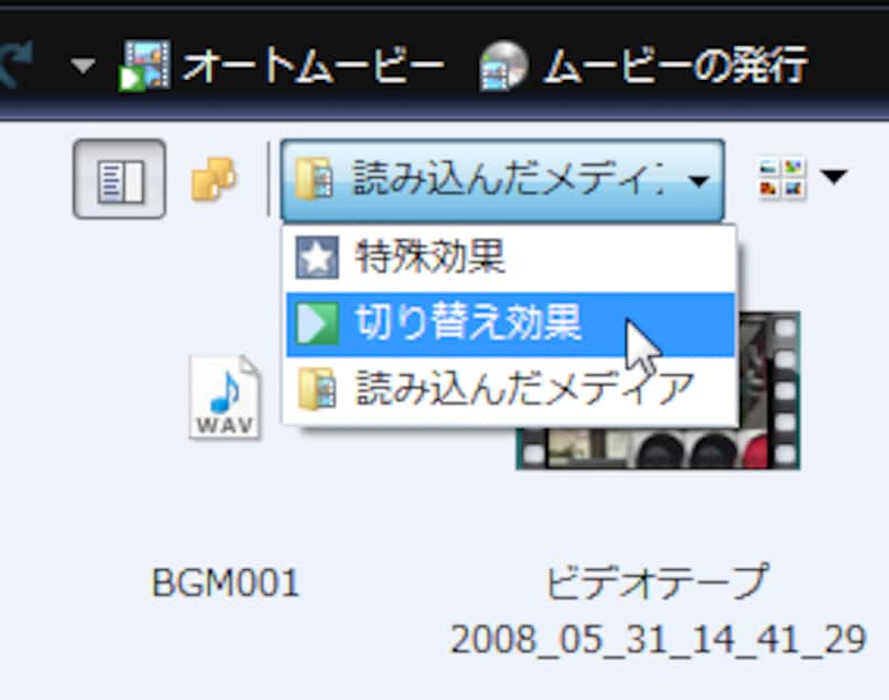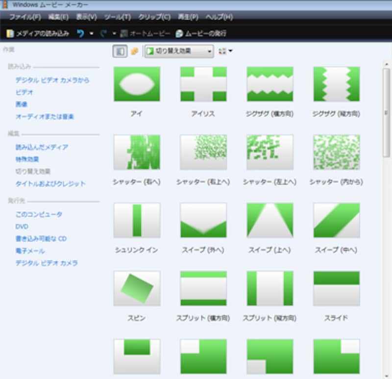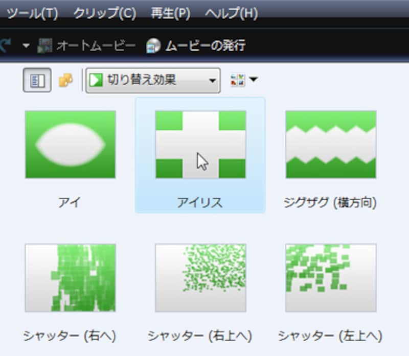 「作業」の「編集」にある「切り替え効果」をクリックしてください。利用できる切り替え効果の一覧が表示されます。