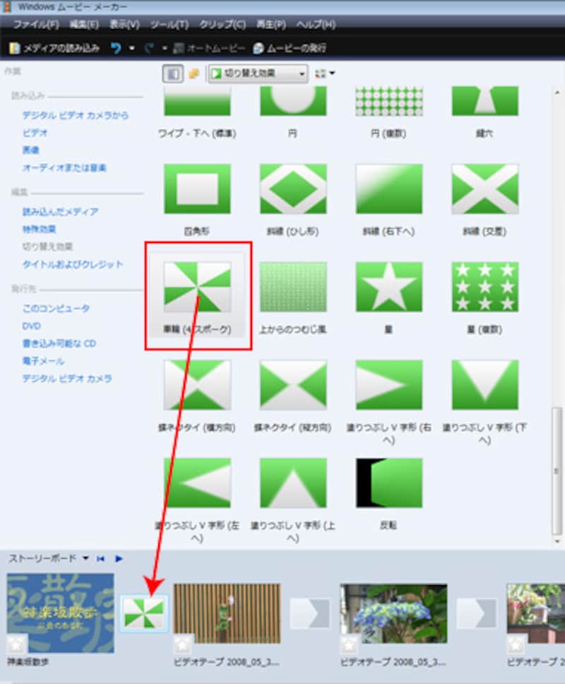 では、第3回の解説でトリミングしたムービーに、切り替え効果を設定してみましょう。