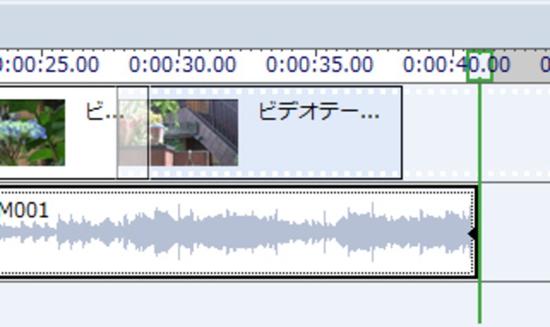 サウンドデータのトリミングでは、ビデオよりちょっと長めにトリミングします。こうすると、映像が消えても少しだけBGMが流れ、余韻が残ります。